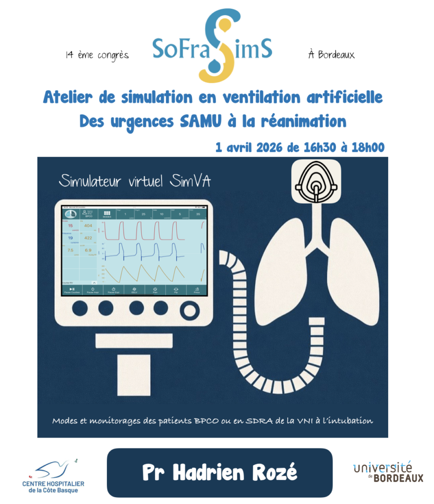 News SOFRASIMS 2026 19 February 2026 Hadrien Roze 0 Comments The French society of simulation in healthcare will be in Bordeaux in April 2026, a workshop on simulation of mechanical ventilation with SimVA will take place at 4.30 PM the first of April !